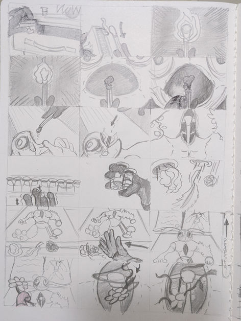 These thumbnail sketches were my pitch to the Director. I wanted to show that I could use my love of cinematography and mixed camera angles, even in stop motion where you need to keep the actual camera steady for the puppeteering. At this point, the character wasn't set in stone, and after this, the script was cut significantly. But it was a good basis for what some of the props might have been needed to accomplish, so the prop team could start on production faster.